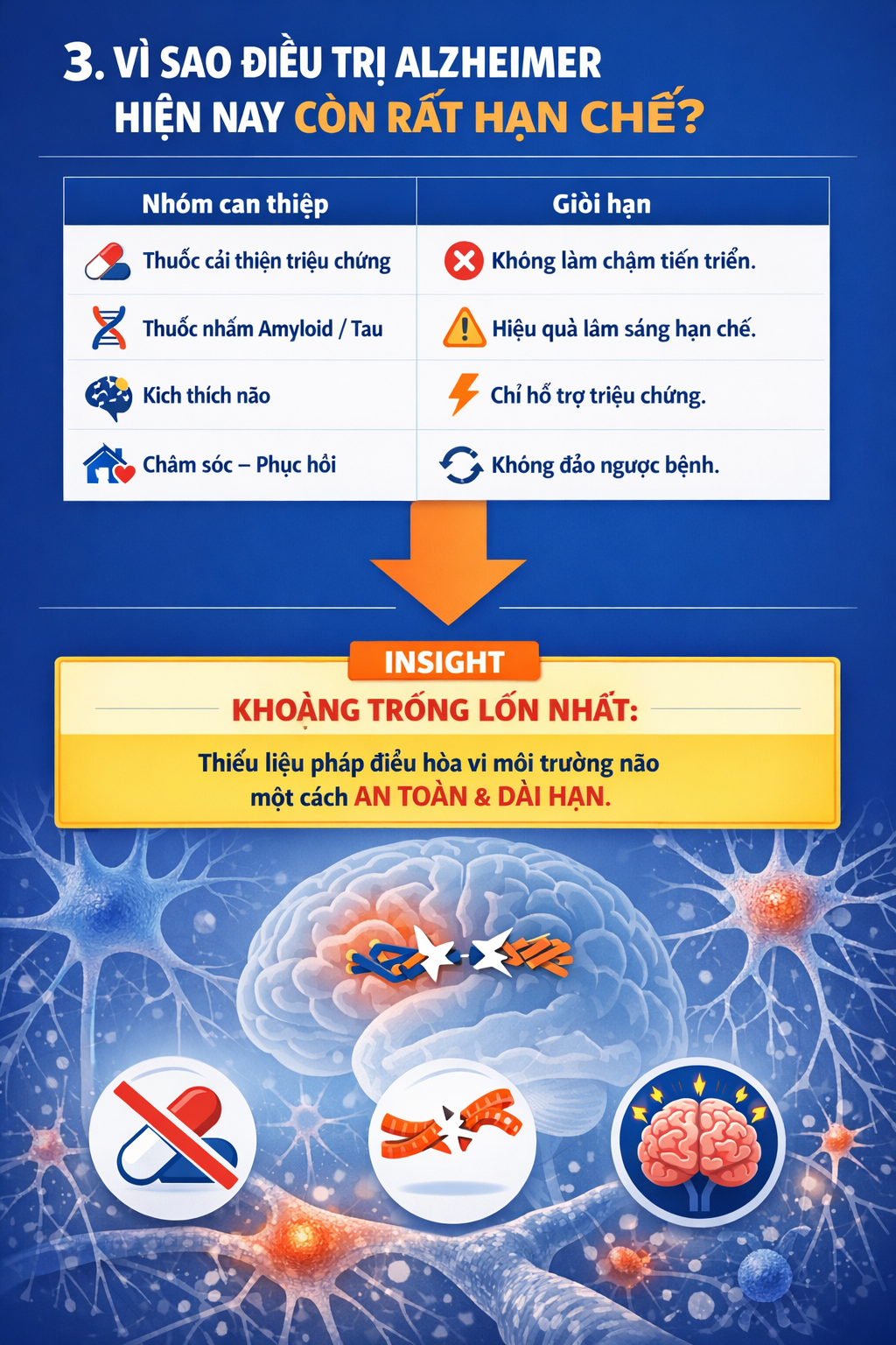 👉 Khoảng trống lớn nhất: thiếu liệu pháp điều hòa vi môi trường não một cách an toàn, dài hạn.