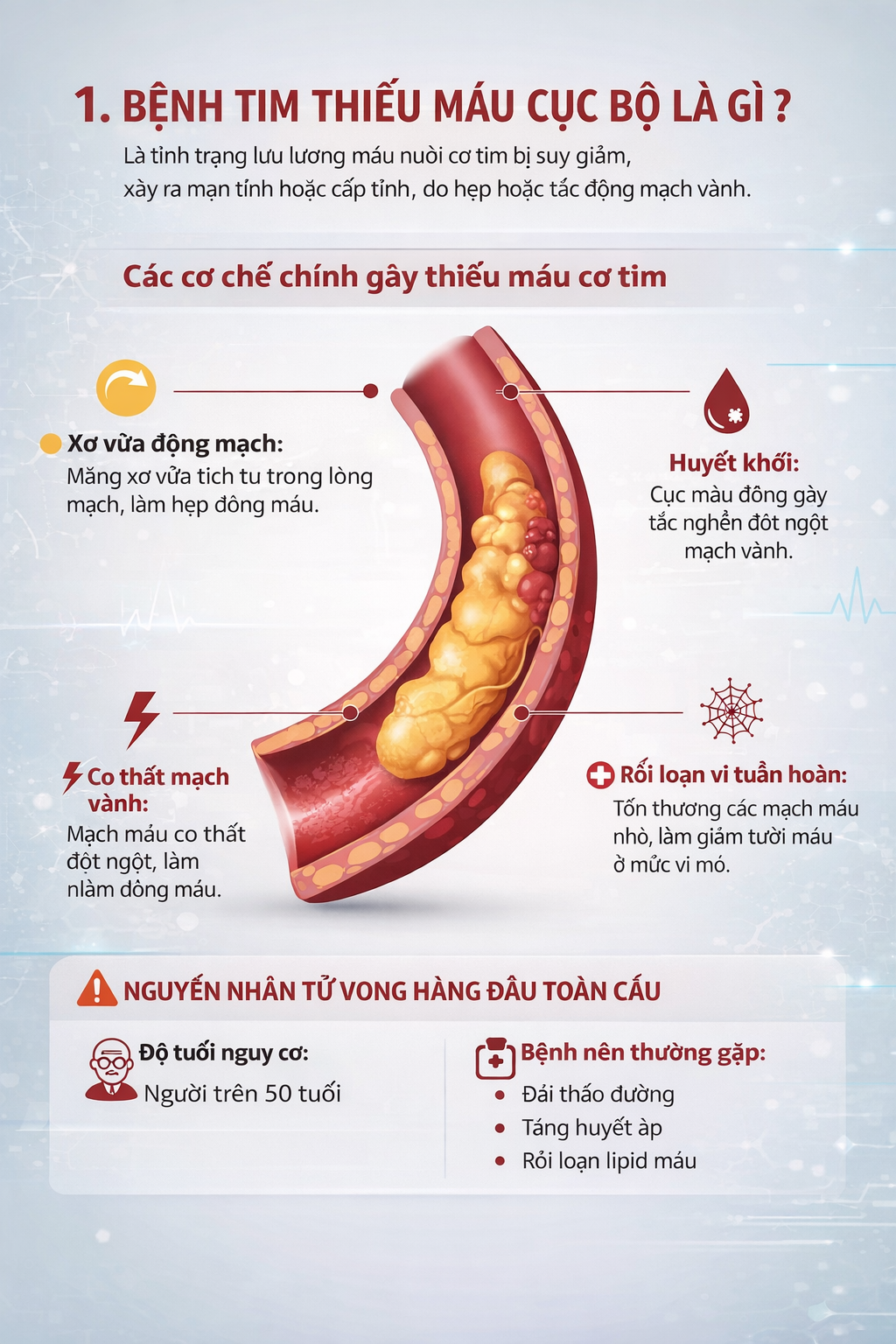 Bệnh tim thiếu máu cục bộ (Ischemic Heart Disease – IHD) là tình trạng lưu lượng máu nuôi cơ tim bị suy giảm mạn tính hoặc cấp tính, chủ yếu do: