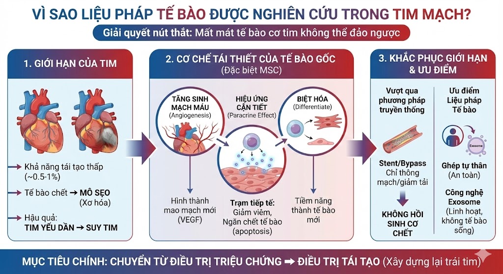Liệu pháp tế bào trong bệnh lý tim mạch là một hướng đi khoa học có tiềm năng, đặc biệt trong bối cảnh các phương pháp hiện tại chưa giải quyết được tổn thương cơ tim không hồi phục.