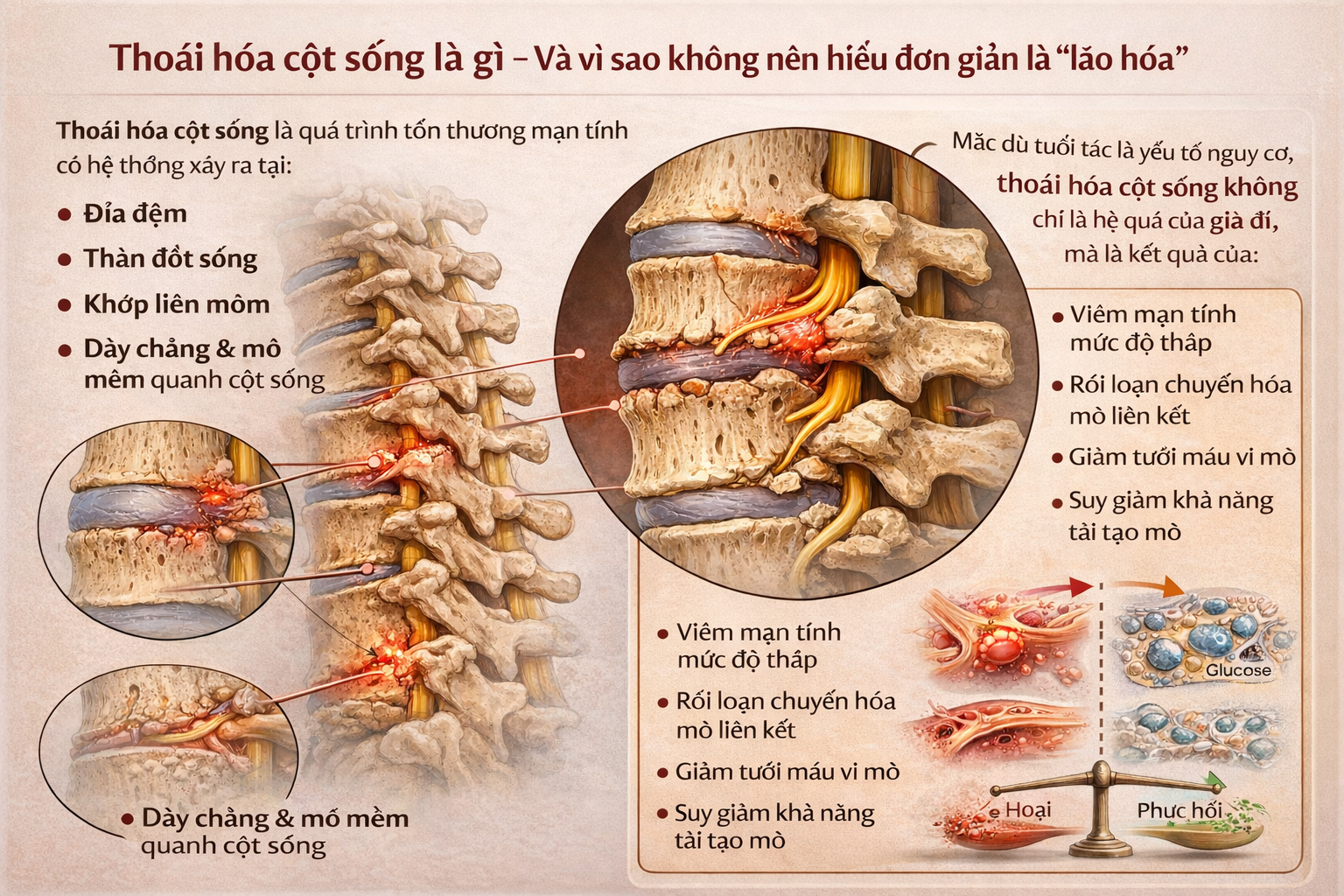 👉 Thoái hóa cột sống là bệnh lý viêm – thoái hóa kết hợp, không thuần cơ học.